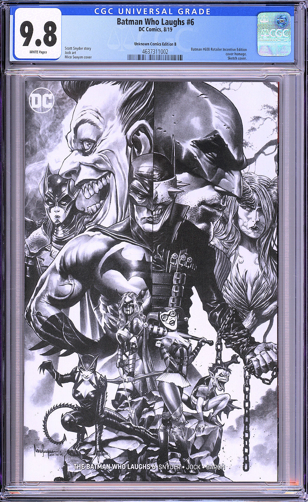 CGC 9.8 (NM/MT) copy of Batman Who Laughs #6 Unknown Comics Mico Suayan Minimal Black & White Exclusive! Official CGC page description is "WHITE Pages".