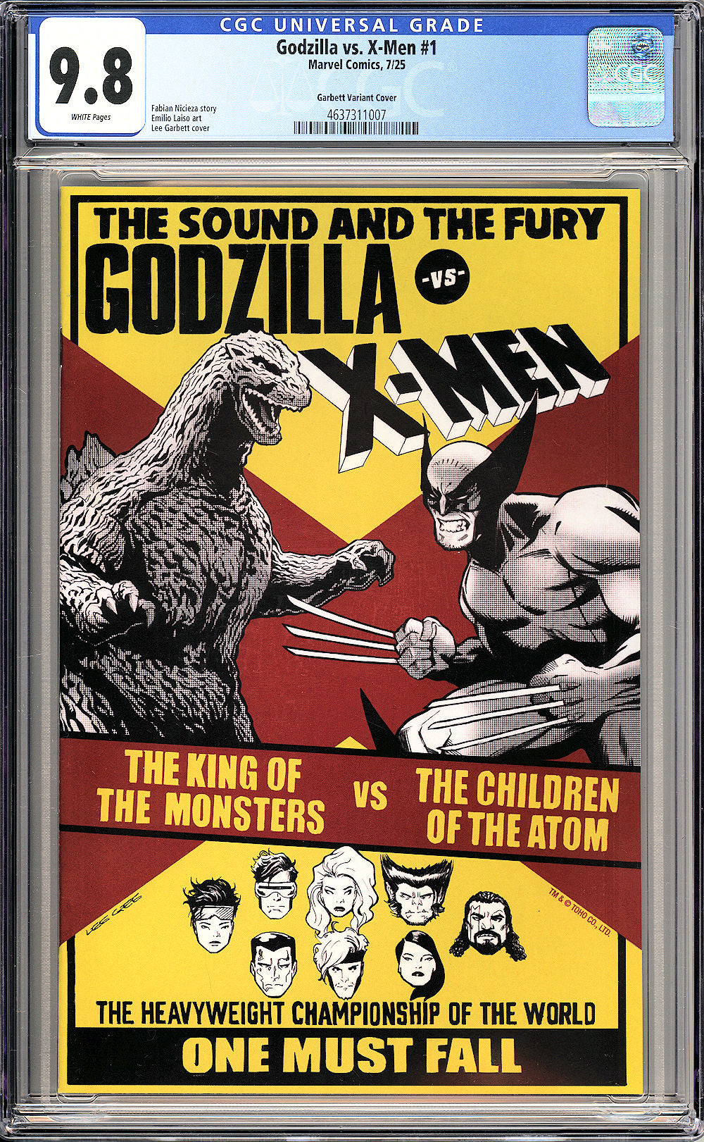 CGC 9.8 (NM/MT) copy of Godzilla Vs X-Men #1 - Cover C - Lee Garbett Versus Variant. Official CGC page description is "WHITE Pages".