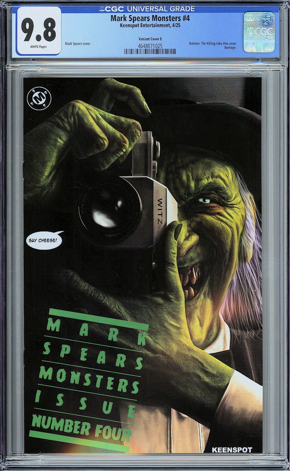 CGC 9.8 (NM/MT) copy of Mark Spears Monsters #4 - Cover E - Killing Joke Homage Variant - CGC page description is "WHITE Pages".